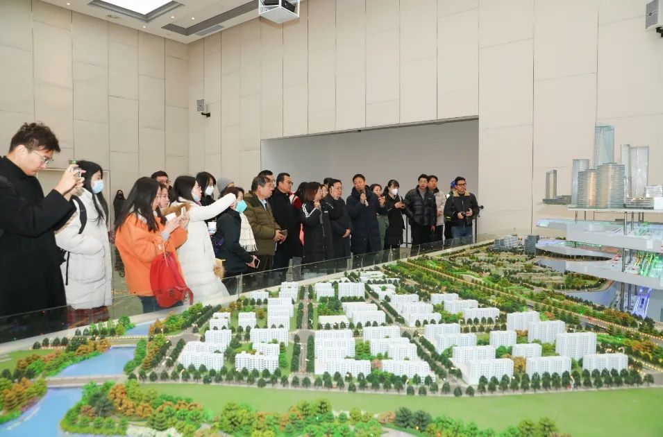 2月2日,30余家中央和行业媒体记者走进北京城市副中心站综合交通枢纽工程01标段站房。图为记者听取北京城市副中心站立体沙盘讲解。胡锋锋摄