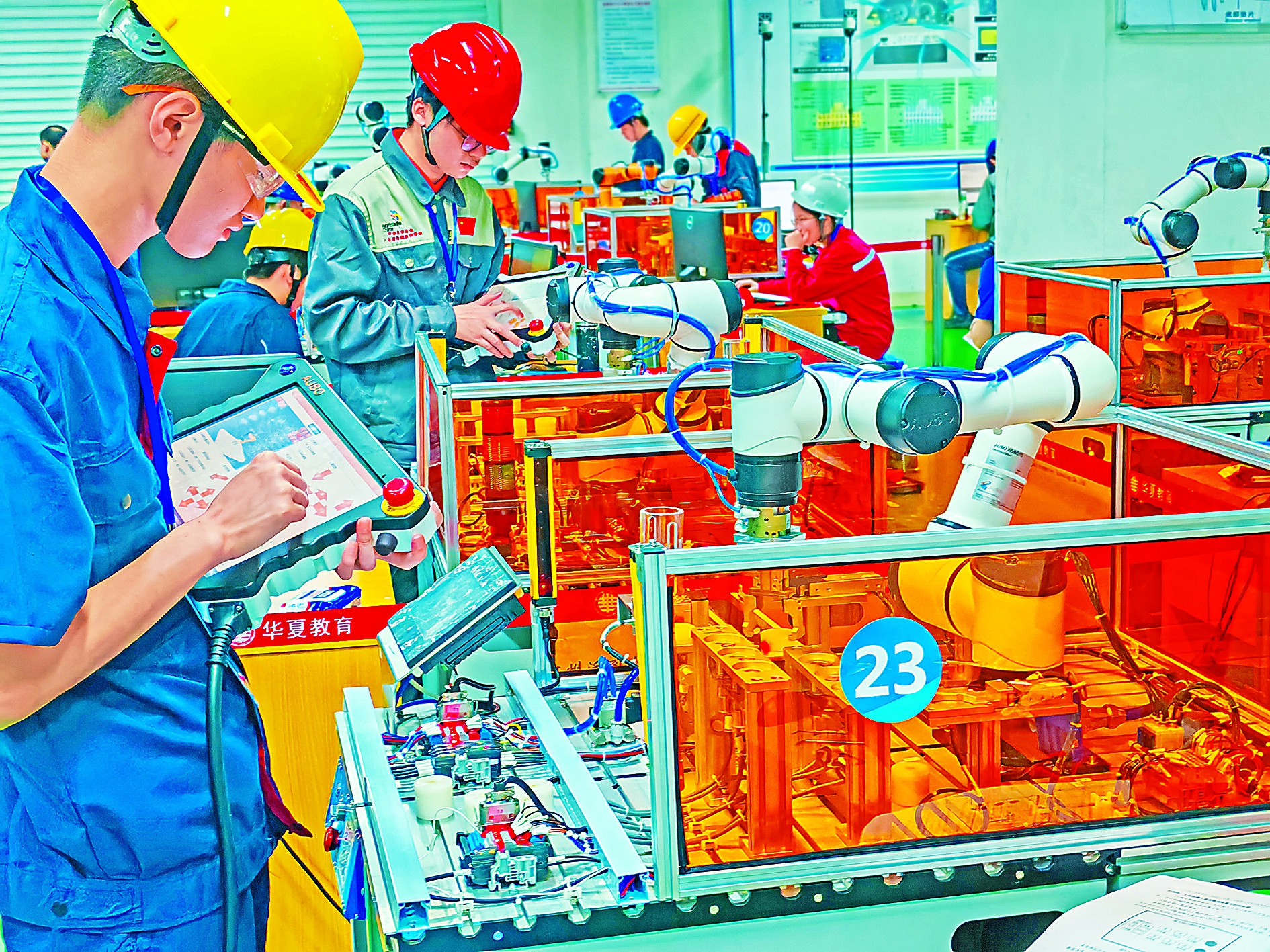 近日,“广东中华职教杯”2024年广东省工业机器人系统运维员职业技能竞赛在广州落幕。为期3天的大赛共吸引了全省59家技工院校及企业共计237名工业机器人运维能手报名参赛。图为选手在比赛中。
